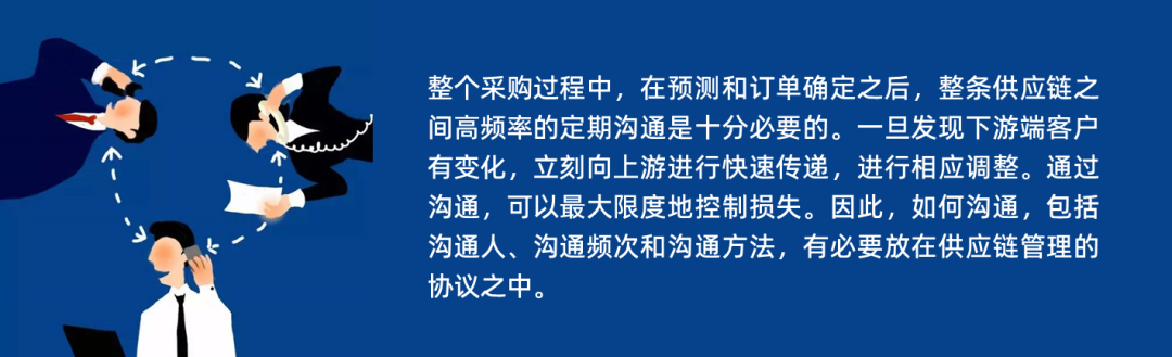 其次,長周期零部件之所以管理難度比較大,是因為客戶的交付需求變化比較大。幾個月周期的采購訂單,零部件收到后,客戶的需求早就面目全非了。于是,要么需求增加,零部件短缺,要么需求減少,零部件庫存大增,甚至造成呆滯。因此,整個采購過程中,在預測和訂單確定之后,整條供應鏈之間高頻率的定期溝通是十分必要的。一旦發(fā)現(xiàn)下游端客戶有變化,立刻向上游進行快速傳遞,進行相應調整。通過溝通,可以最大限度地控制損失。因此,如何溝通,包括溝通人、溝通頻次和溝通方法,有必要放在供應鏈管理的協(xié)議之中。