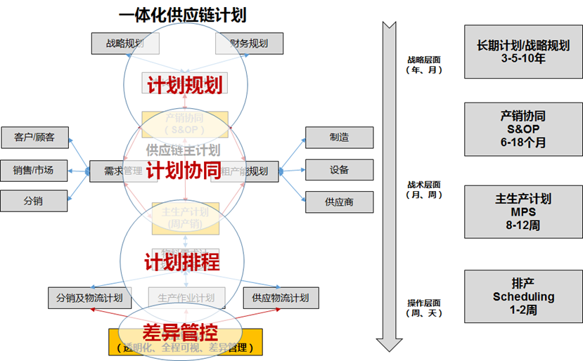 供應(yīng)鏈一體化計劃體系要從橫向和縱向來理解:橫向上涉及顧客、門店、經(jīng)銷商、品牌商、工廠、供應(yīng)商等節(jié)點之間的計劃拉通,包括銷售計劃、需求計劃、生產(chǎn)計劃、采購計劃、物流計劃等計劃之間的拉通與協(xié)同;縱向上包括長期年度規(guī)劃、中期產(chǎn)銷協(xié)同計劃、主生產(chǎn)計劃與作業(yè)計劃排程等各維度之間的傳承與呼應(yīng)。